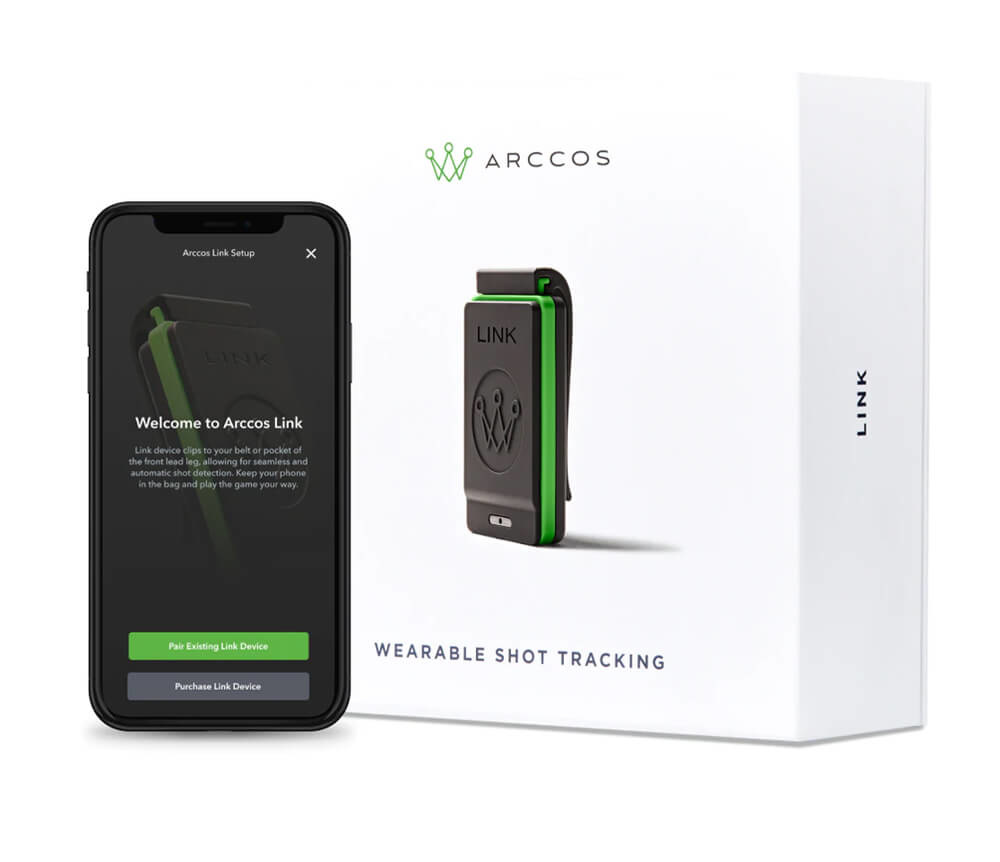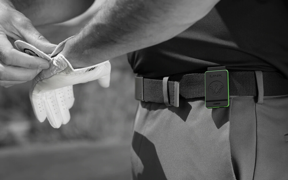 The Arccos Caddie Link is compatible with iPhone and Android devices and can be clipped onto the belt or pocket. It works independently of the phone and transmits data during or after a round, depending on the player's preference.