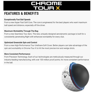 New Hyper Fast Soft Core. The core of the Callaway Chrome Tour X golf balls is designed for better golfers seeking the best balance between long distance and soft feel.