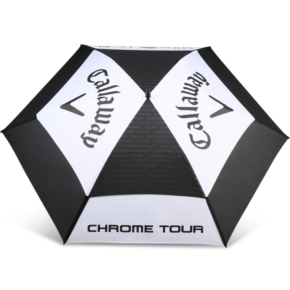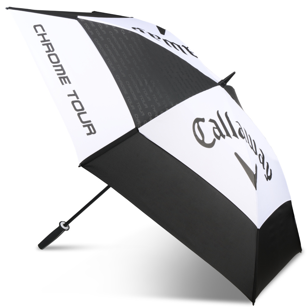 The 2026 version of the luxurious Callaway Tour Authentic Double Canopy golf umbrella looks great. With its two-piece black and white canopy, it has a diameter of 68 inches (approximately 172 cm), measured across the rounded top. The umbrella features a beautiful, large Callaway logo and Tour branding. The UV 50+ protection of this umbrella coating makes it a good choice whether it's raining or the sun is shining.