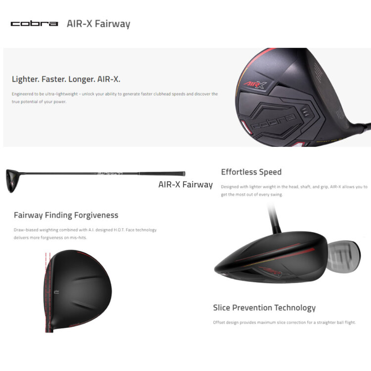 This 'refreshed' Cobra Air-X2 Ladies left hand fairway wood 2024 comes with featherweight Cobra UltraLite graphite shaft and Lamkin EPDM REL UnderSize grip.