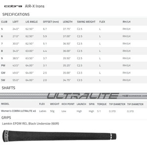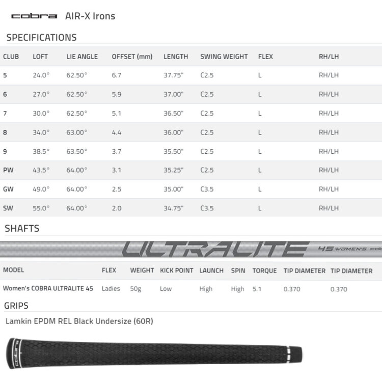 As standard, these super-lightweight graphite-shaft clubs are fitted with lightweight 45-gram Cobra UltraLite-45 graphite shafts and Lamkin EPDM R.E.L. women's 58R Grips.