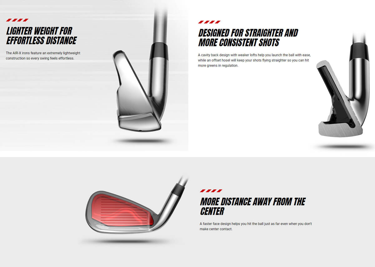 These Cobra Air-X irons are the successors to the segment-renowned 3rd generation F-Max irons. Looking at the clubs themselves, you can tell from the specifications which target group they are made for: somewhat larger, 'game improving' club heads, a huge sweet spot, a lot of weight at the bottom of the club head and a thin but strong accelerating face. These are the characteristics that make these Air-X irons sets very suitable for beginning to intermediate golfers.
