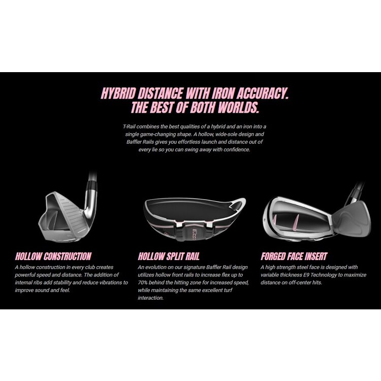 Many features from Cobra's 'normal' women's irons are integrated in this T-Rail series: Large club heads with huge sweetspots combined with a low centre of gravity make irons already very playable. The Baffler T-Rail technique, which Cobra has been using for years in its hybrid clubs and fairway woods, has also been put into the irons here. Because of this, the clubs have much less resistance to the ground so there is much more club speed left. For many, golf is a tricky, technical sport in which these Cobra T-Rail hybrid irons make it a bit easier to launch the ball straight and far without too many technical skills. This makes them very suitable for beginners to somewhat advanced golfers (handicap 18-54). Due to the 'Forged' clubface, the clubs are far from numb, in contrast to many hybrid irons from other brands.