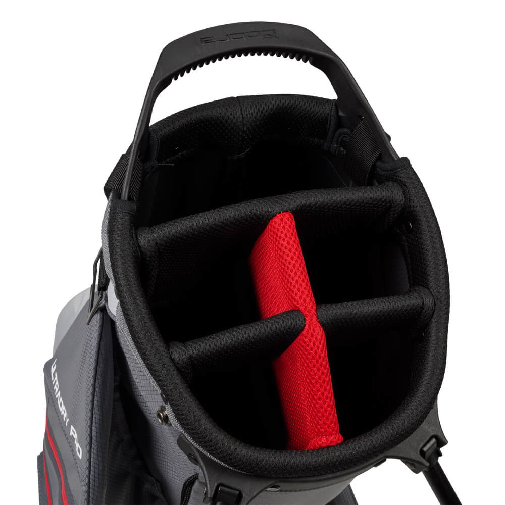 This is the practical, lightweight Cobra UltraDry Pro Stand Bag finished in grey with red (according to Cobra 'High Rise' with 'High Risk Red'). The bag features 5 storage compartments, 5-way top element and a very comfortable carrying system. This model has a sturdy fold-out base and weighs barely 2 KG!