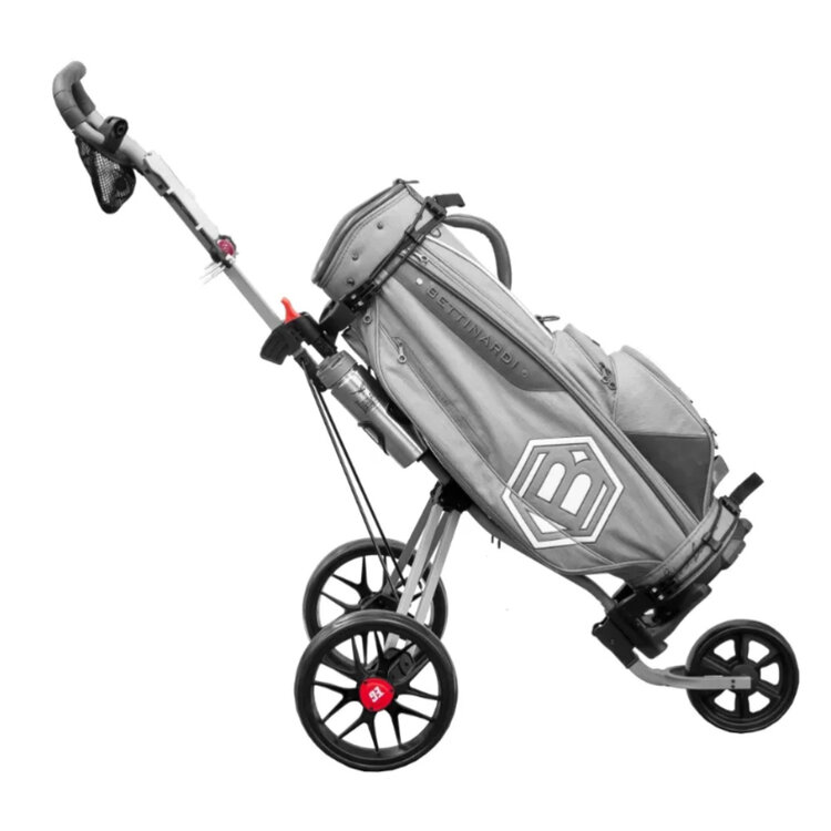 With its sturdy but lightweight frame construction, this grey EzeGlide Ranger 3-wheel trolley is a competitively priced trolley that is easy to fold and unfold. Fitted with a water bottle holder, console with a card holder, and storage net for loose items