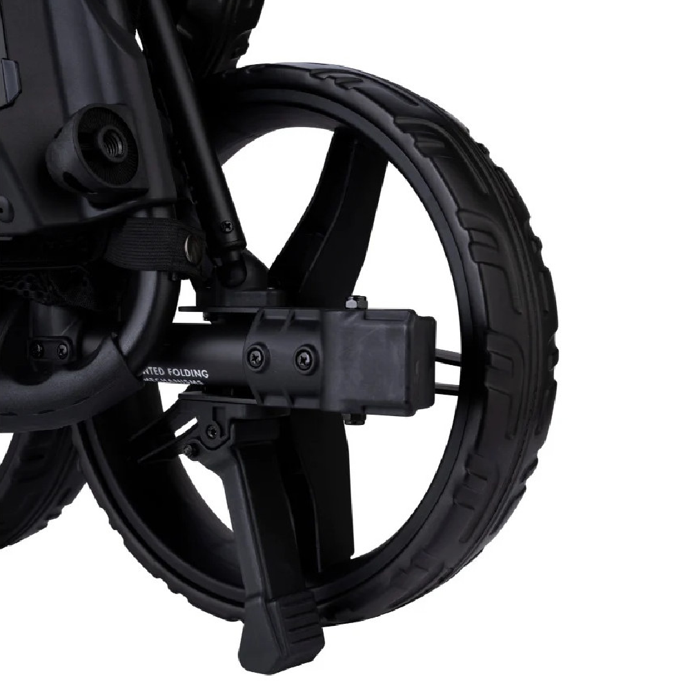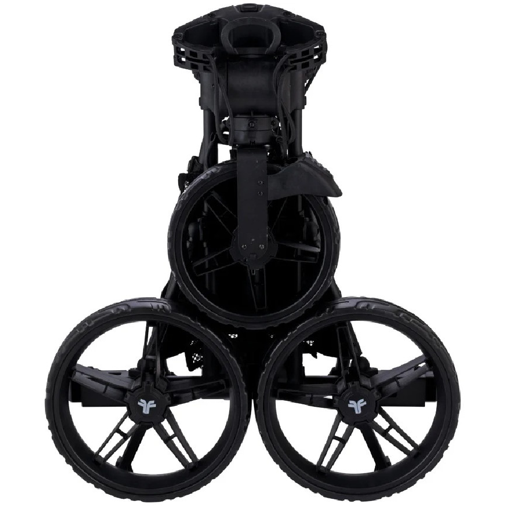This black golf trolley with black wheels is called the FastFold Compact +. The biggest advantage of this model is the incredible ease with which it folds down into a very compact package. This sturdy three-wheeled golf trolley has a strikingly wide wheelbase, making it extremely stable. As well as its attractive design, it features a long list of handy details. Fitted with extra-large 12-inch rear wheels a