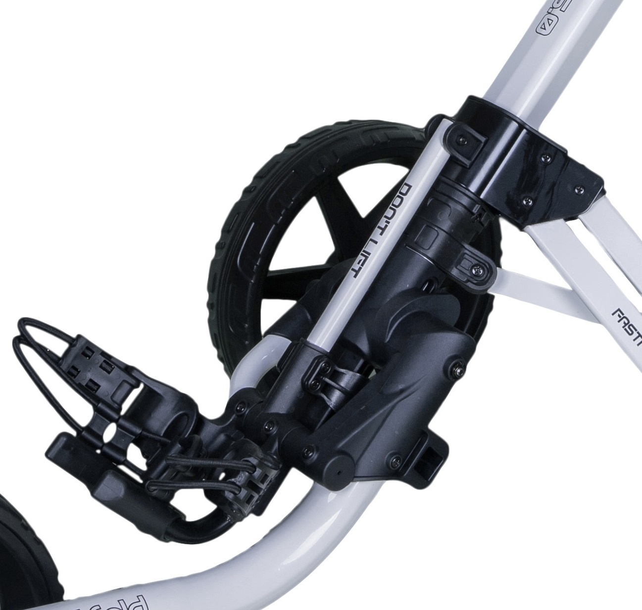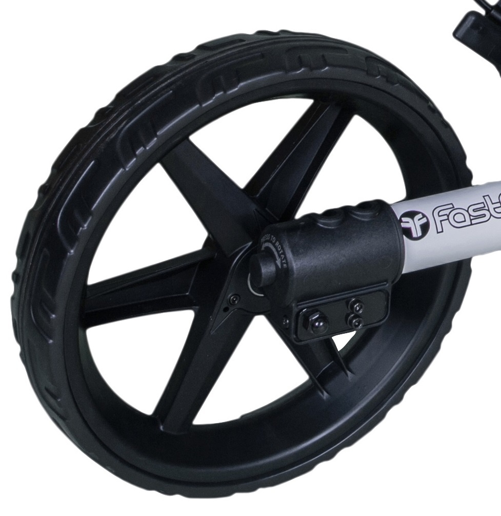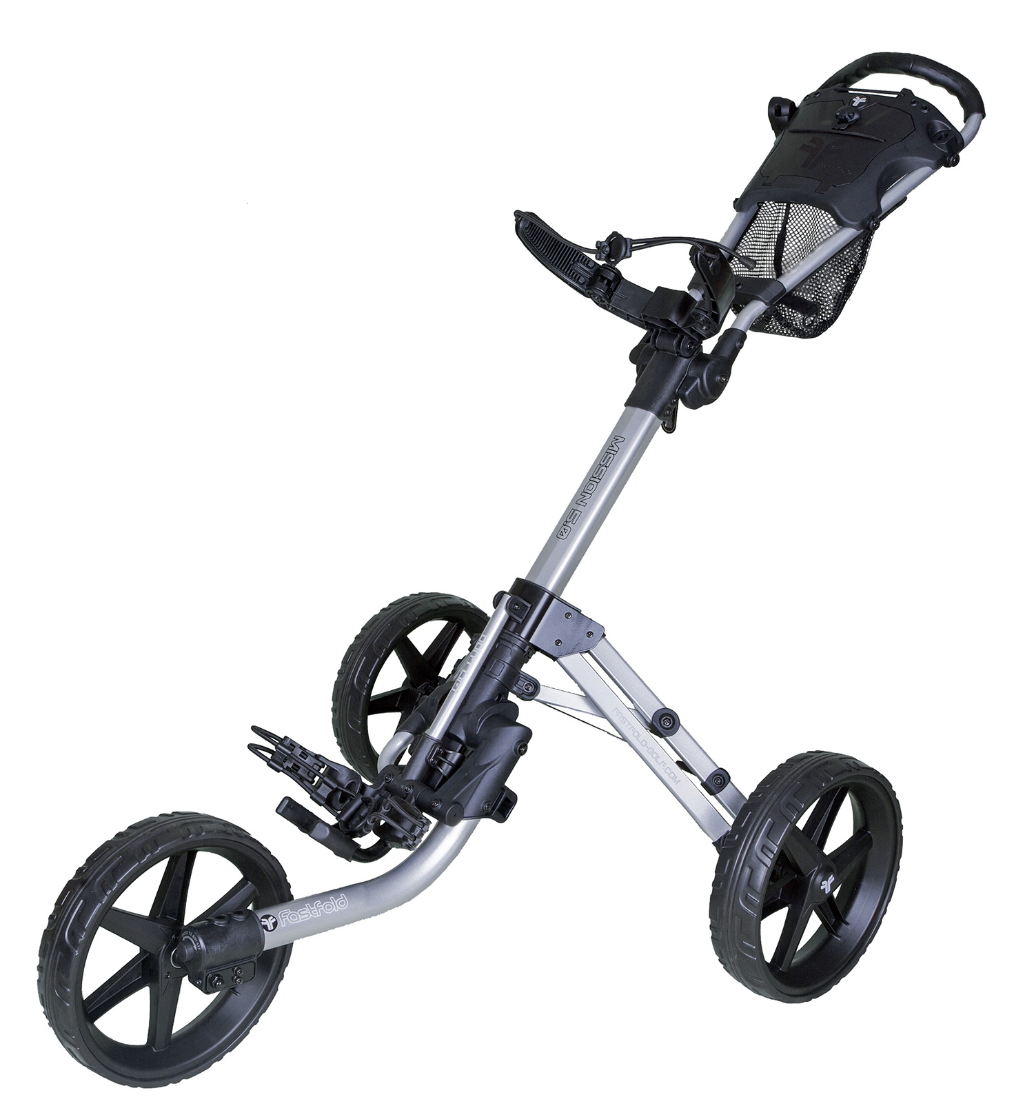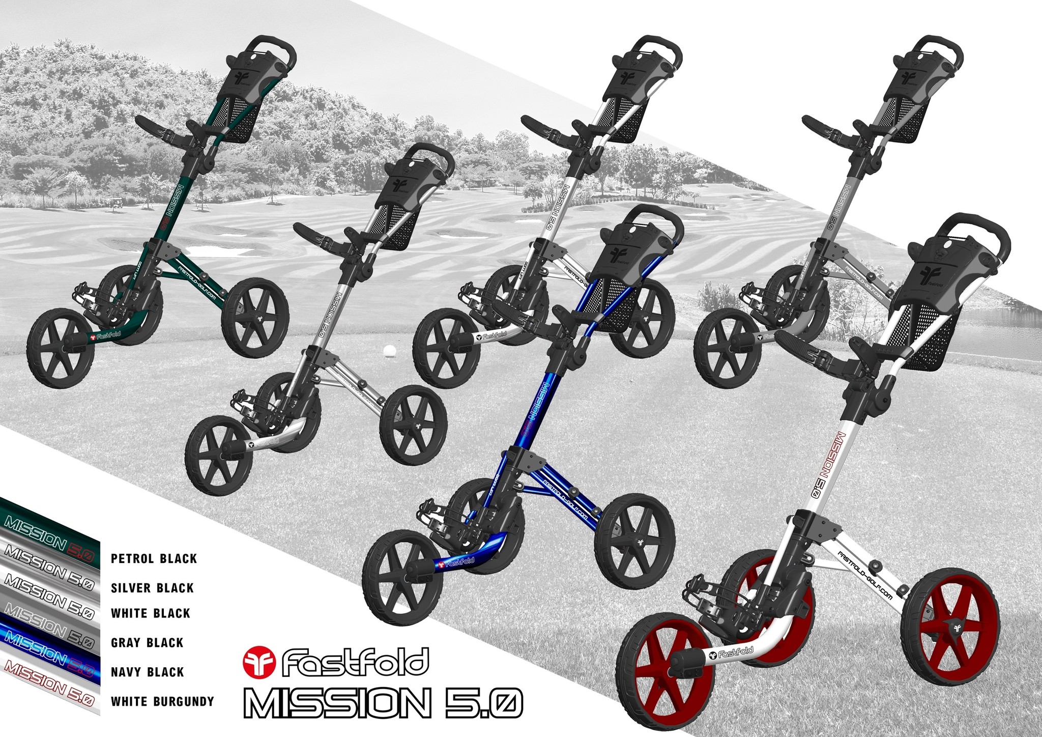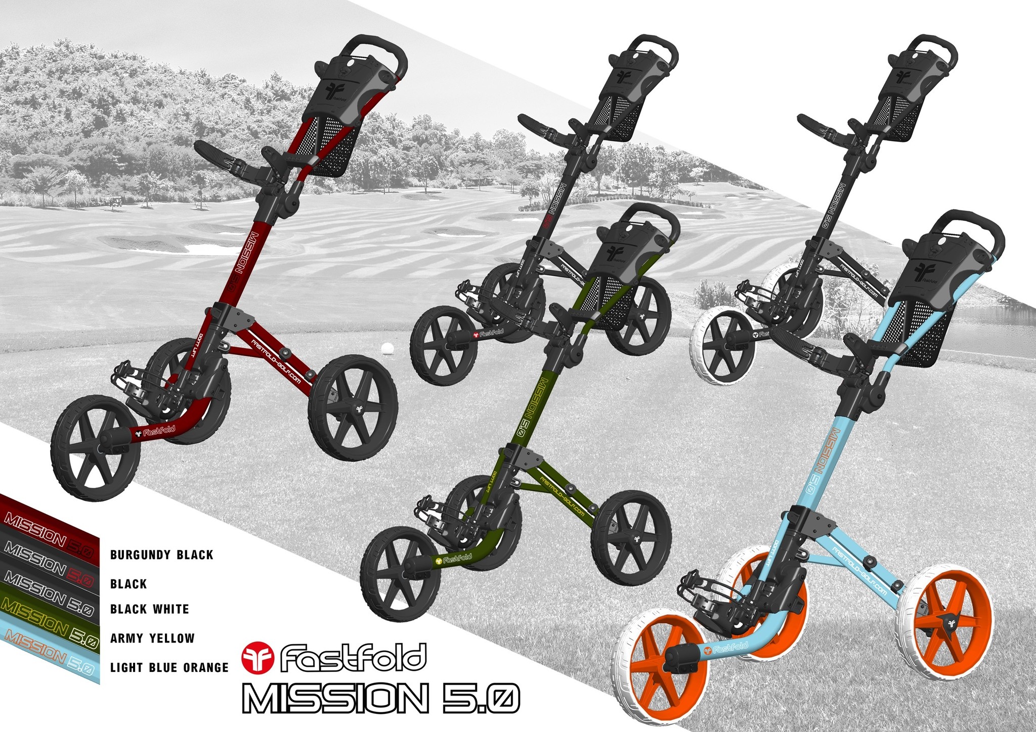 This is the FastFold Mission 5.0 3-wheel trolley with its recognizable design. Nice and stable due to its low center of gravity, sturdy, and very practical to use. Easily foldable to a very compact package. Top trolley, available in many colors! It looks a lot like 'that other popular golf trolley' but has been sharpened on several points.