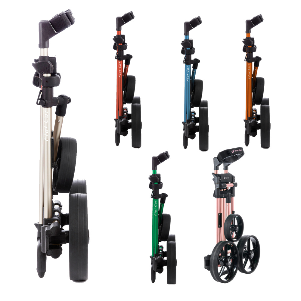 More than noticeable plus points: folded up, this trolley is very narrow (16 cm), so it fits behind the driver's seat in your car. Also, the weight of this FlatCat Gear-2 is about 2 to 3 kilos less than MotoCaddy and Powakaddy trolleys.