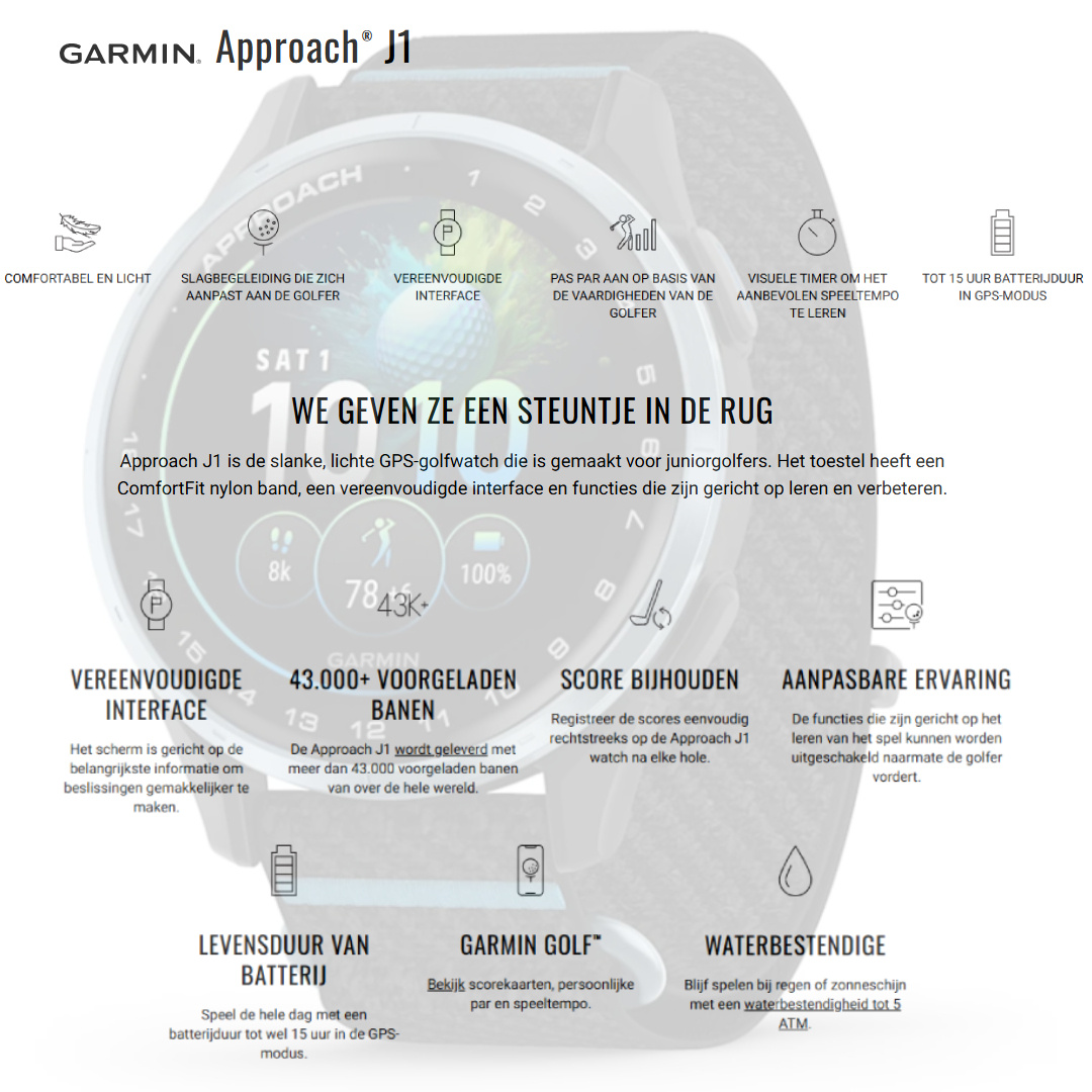 The Garmin J1 is a truly handy, advanced golf watch. Upload your scorecards after each round to Garmin Express to view your game and scores throughout the season. You can also use the free Garmin Golf™ app (3-month free trial) to participate in weekly rankings and tournaments. In addition to golf, the watch also supports basic activities such as walking, running and cycling, and features standard functions such as a pedometer, alarm clock and stopwatch.