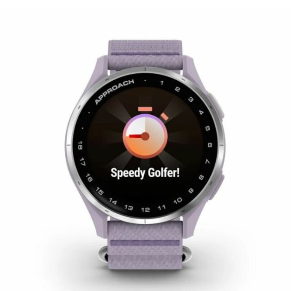 This Garmin Approach J1 Junior in lilac 2026 edition is a watch specifically designed for junior golfers. It is lightweight and sturdy, easy to read and equipped with useful features that are easy to operate. Complete a hole and walk from the green to the next tee box, and the watch will automatically move on to the next hole, even during competitions, as the Garmin J1 is permitted for use.