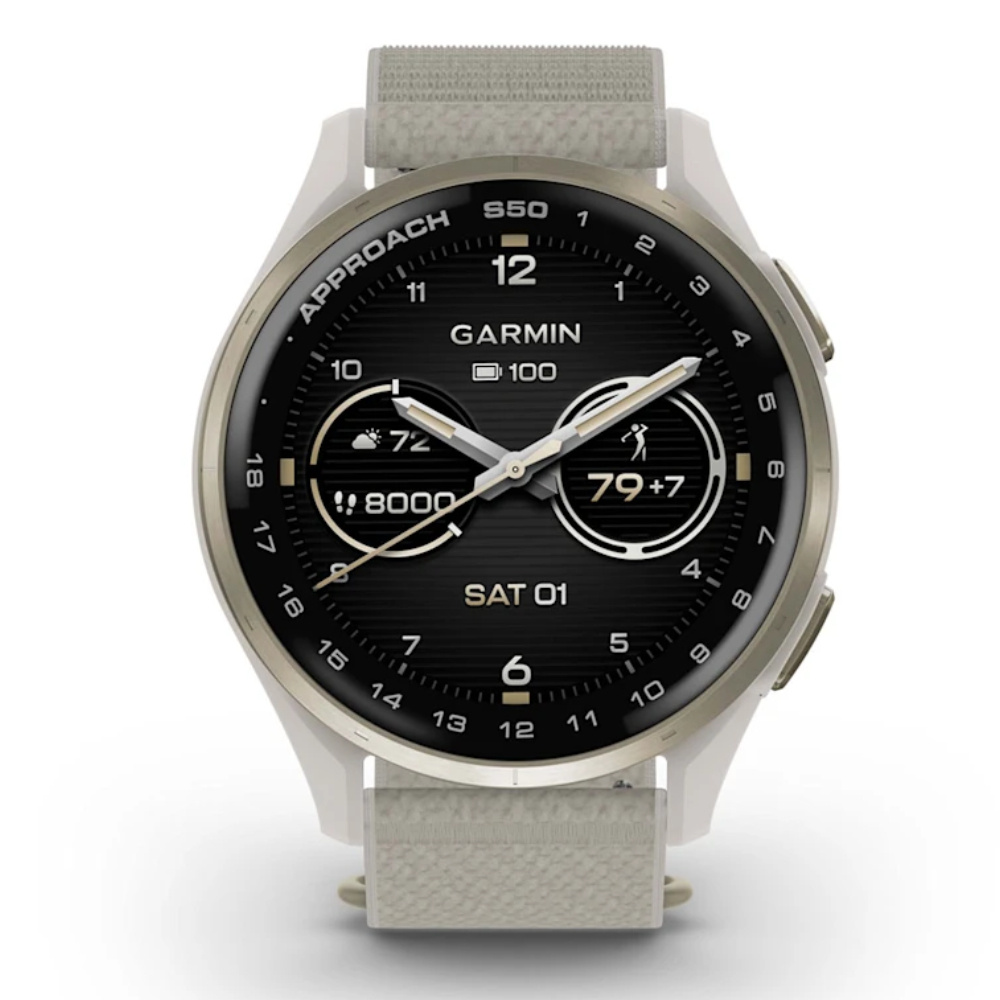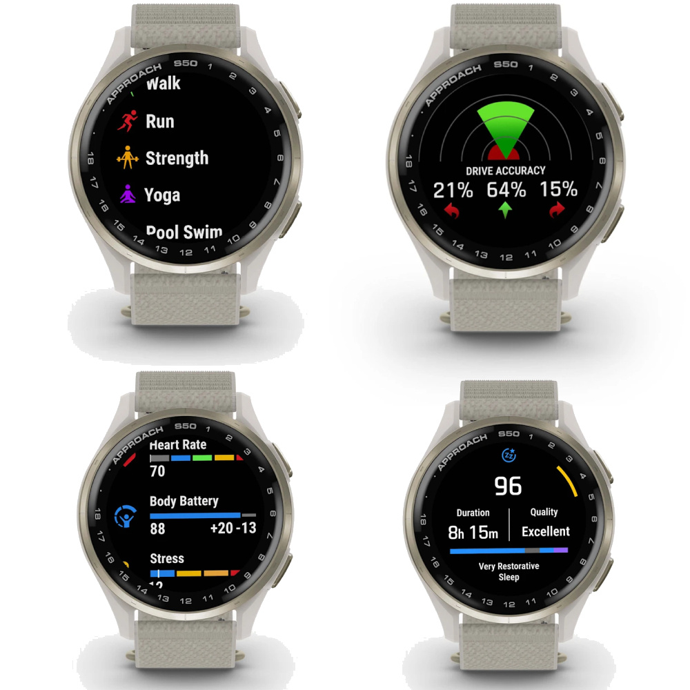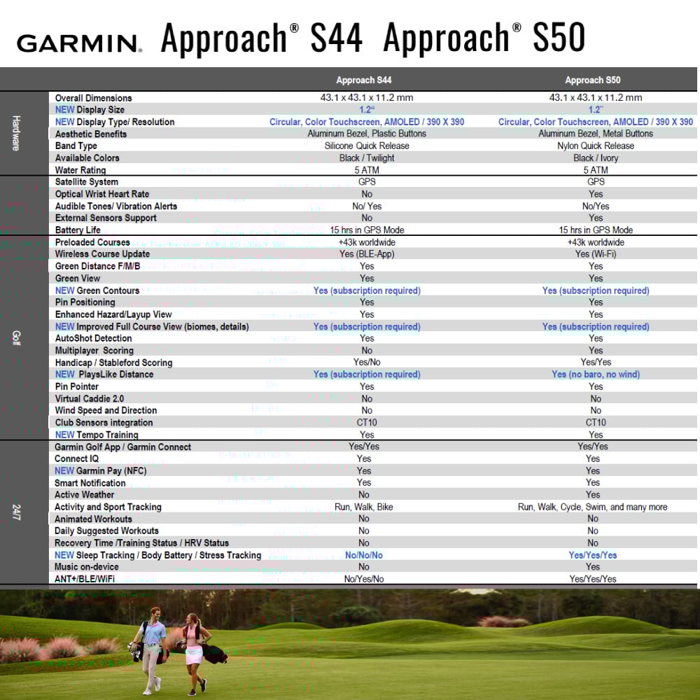 Its 'little brother' with even more functionality than the S44 has is called the Garmin Approach S50 GPS Golf Watch. All-rounder with some smart extras that make it even more interesting. The ivory-finish is also a bit nicer with its metal buttons instead of the S44's plastic buttons. Designed to lower your score on the course and make you look more stylish, even when you're not on the course.