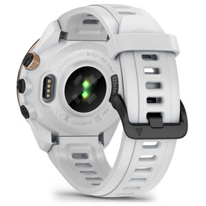 Today's most advanced golf watch is called the Garmin S-70 GPS Golf Watch. In this white 42 mm version, it really is a handy all-rounder that has a very long list of features thanks to a simply set-up menu control. The AMOLED touchscreen has a tremendously high image quality, beautiful colours and high contrast. The latter ensures good readability, even in bright sunlight.