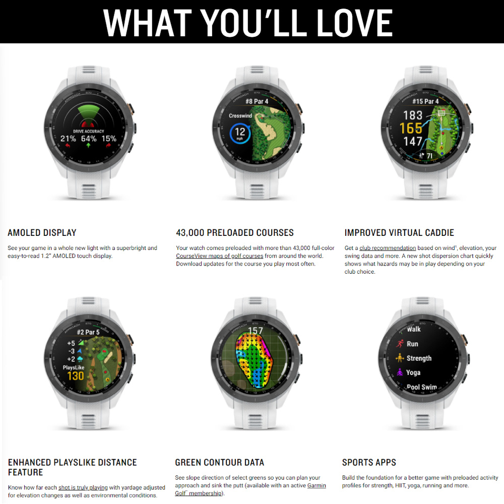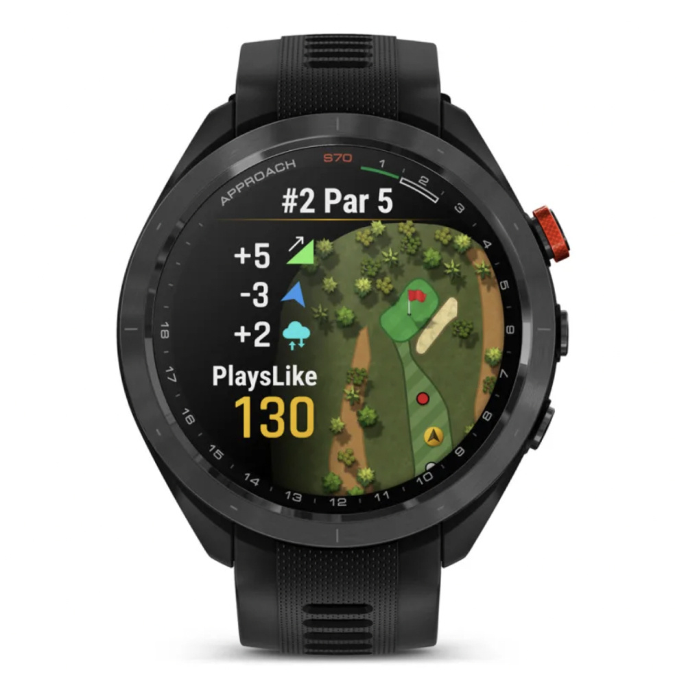 The most advanced golf watch with the largest screen today is called the Garmin S-70 GPS Golf Watch. In this largest, black 47 mm version, the screen is more than 10% larger and the resolution is also higher than in the white and grey versions. Truly a handy all-rounder that has a very long list of features thanks to a simply set-up menu control. The AMOLED touchscreen has enormously high picture quality, beautiful colours and high contrast. The latter ensures good readability, even in bright sunlight.