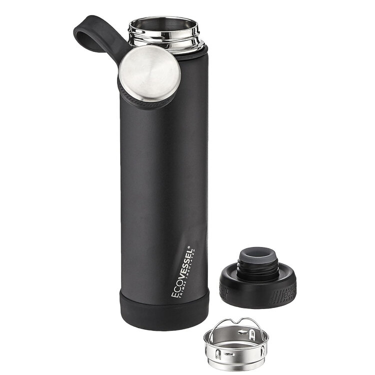 Keep your coffee, tea or other hot or cold drinks at temperature for a long time with this EcoVessel 'The Boulder' stainless steel Water Bottle in luxurious silver finish. It looks beautiful but is also of the highest quality. Insulated at the highest level with TriMax technology and a whopping 709cc capacity. Made of stainless steel (RVS), both inside and out and fitted with a strainer for tea, fruit or ice. Plastic drinking spout for comfortable drinking.