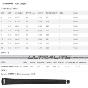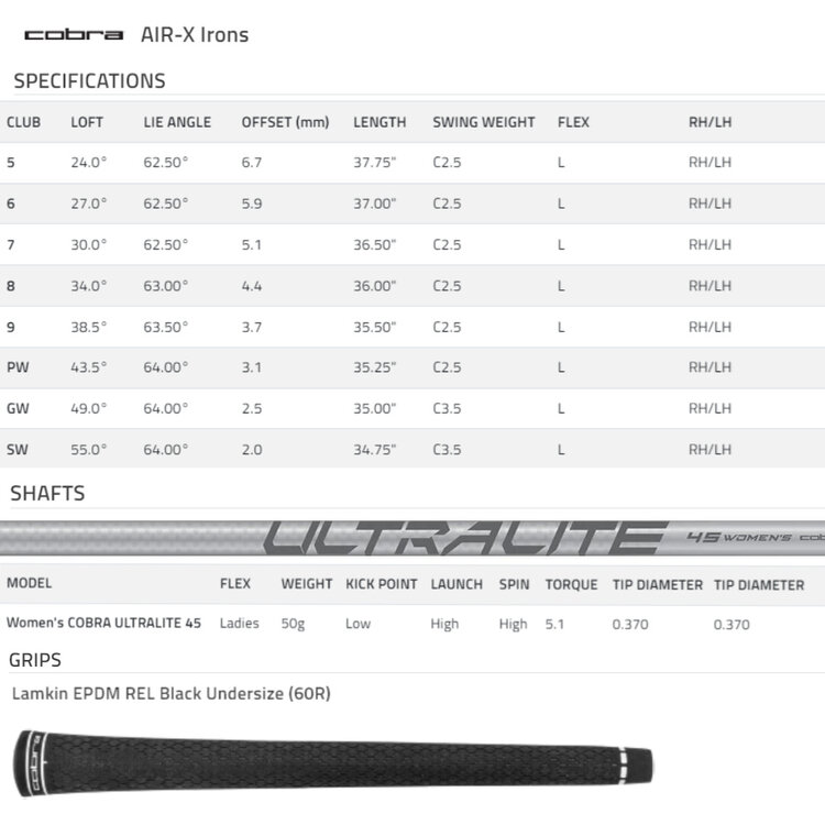 As standard, these super-lightweight graphite-shaft LAdies clubs are fitted with lightweight 45-gram Cobra UltraLite-45 graphite shafts and Lamkin EPDM R.E.L. Ladies Standard 58R Grips.