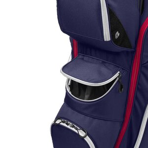 This beautifully designed, very sturdy, Wilson I-Lock Cart bag 2025 in navy blue and red is full of useful details, yet light as a feather. The I-Lock cart bags feature a unique anti-rattle top to avoid any loud noises when walking across the golf course with your trolley. Also, keeps the clubs neatly organized.