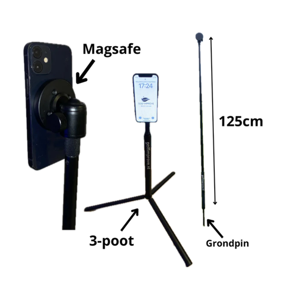 This is the handy Golf Improve Adjustable Smartphone Tripod 2.0 for golfers who are serious about improving their skills! Compact to fold, easy to handle and made of nice, sturdy material. Comes with both tripod and ground pin!