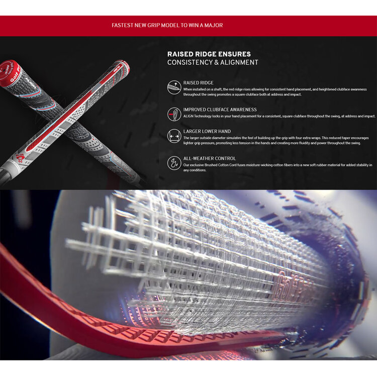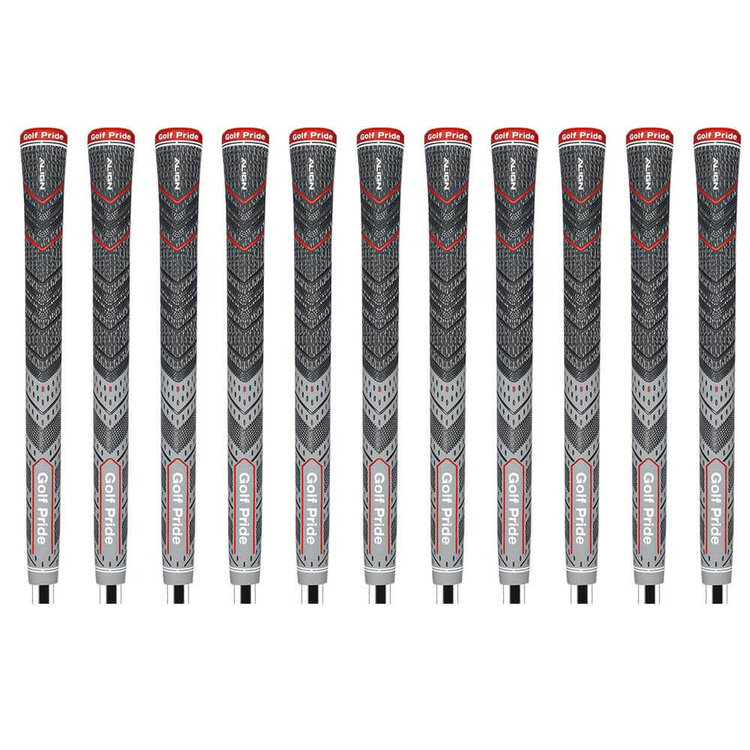 This is the Align version of the , grey GolfPride MultiCompound Plus4 Standard Grip is suitable for irons and all woods. A red, profiled rubber strip on the bottom of these grips makes it easier to get your hands in line. A slightly firmer, finer profile grip that feels softer than standard MCC grips and is thicker on the shaft side (less-taper). As a result, the MCC Plus-4 grip is nearly as thick on the bottom as it is on the top.