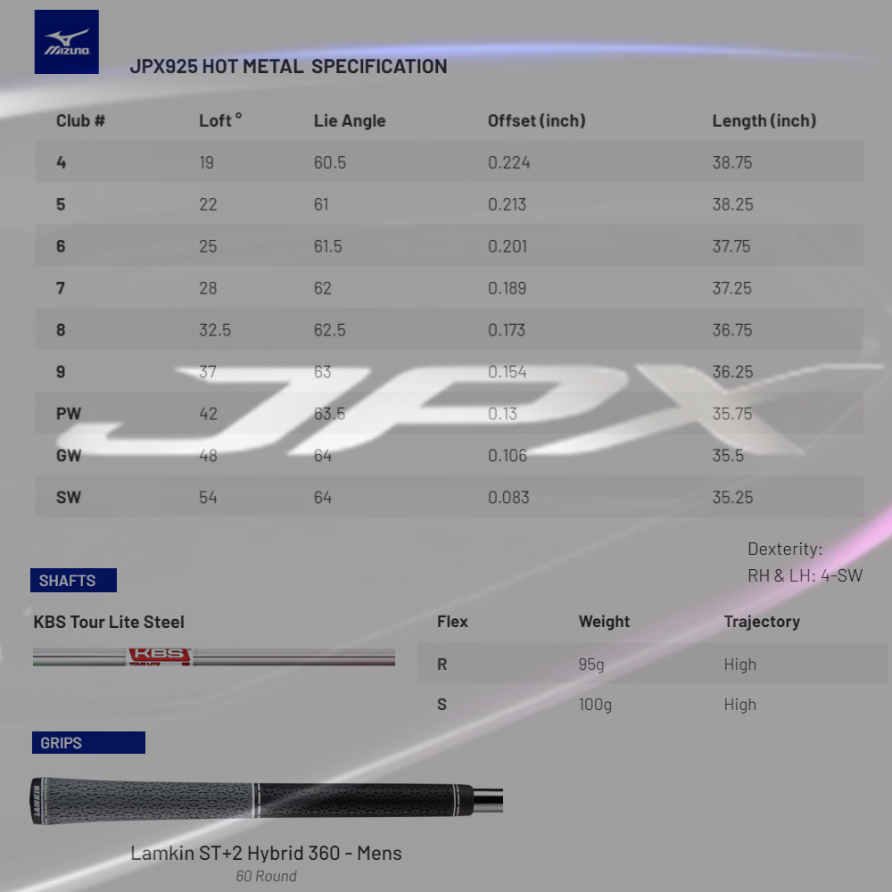 In the standard version, these JPX 925 Hot Metal irons 2025 feature Lightweight Mitsubishi MMT 65-55 Graphite Shaft and Lamkin ST Hybrid +2 Standard Mens Grips.