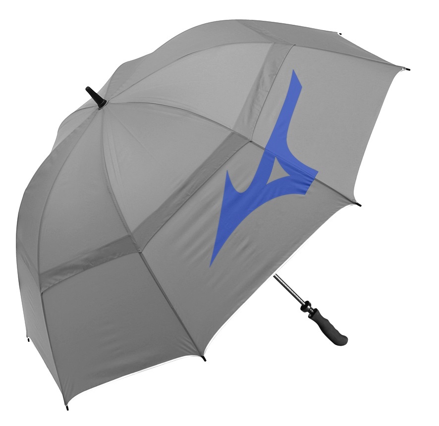 • Sturdy, grey golf umbrella with blue Mizuno branding