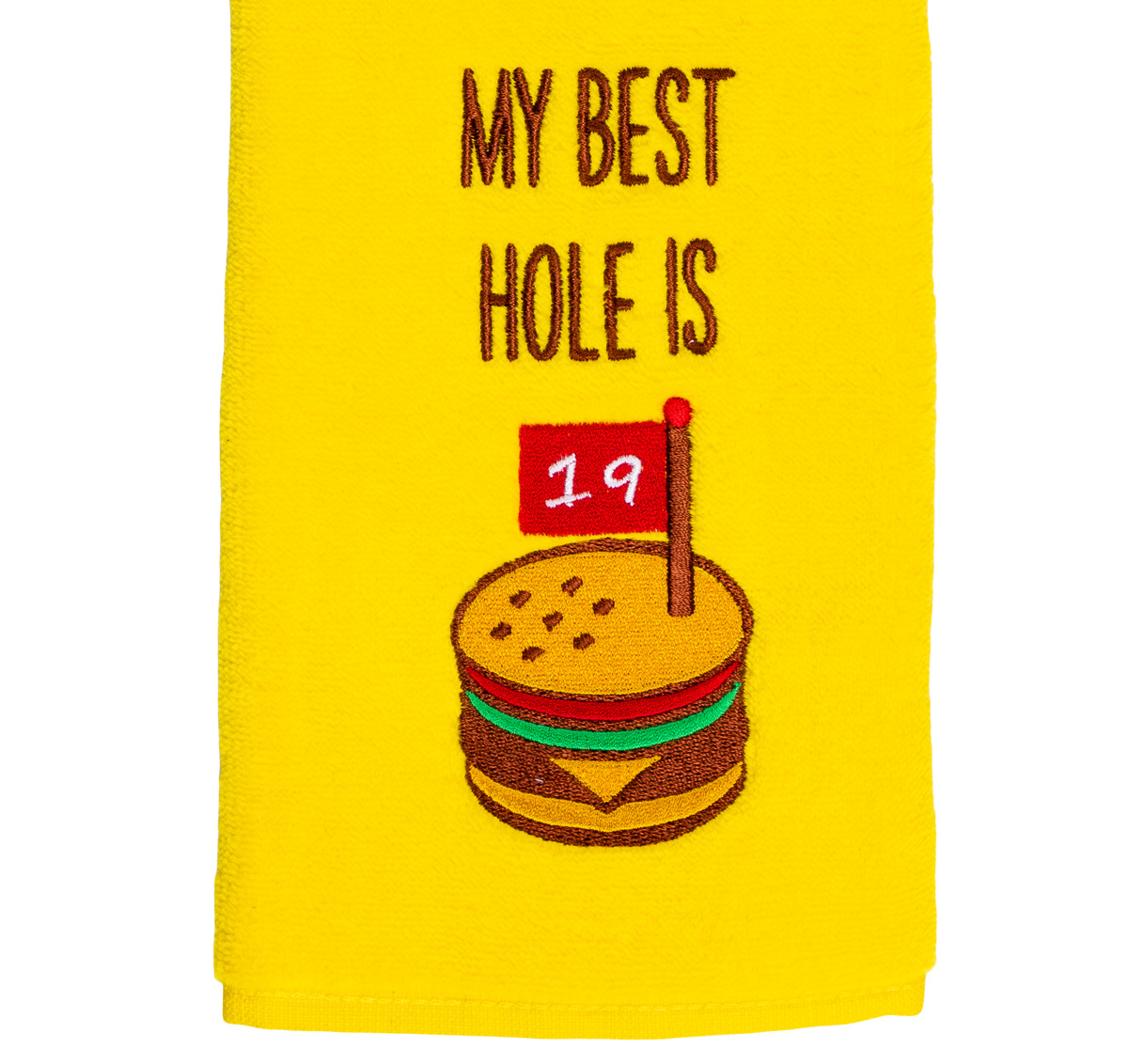DescriptionNova Golf 'My Best Hole Is 19' Golf Towel - Yellow