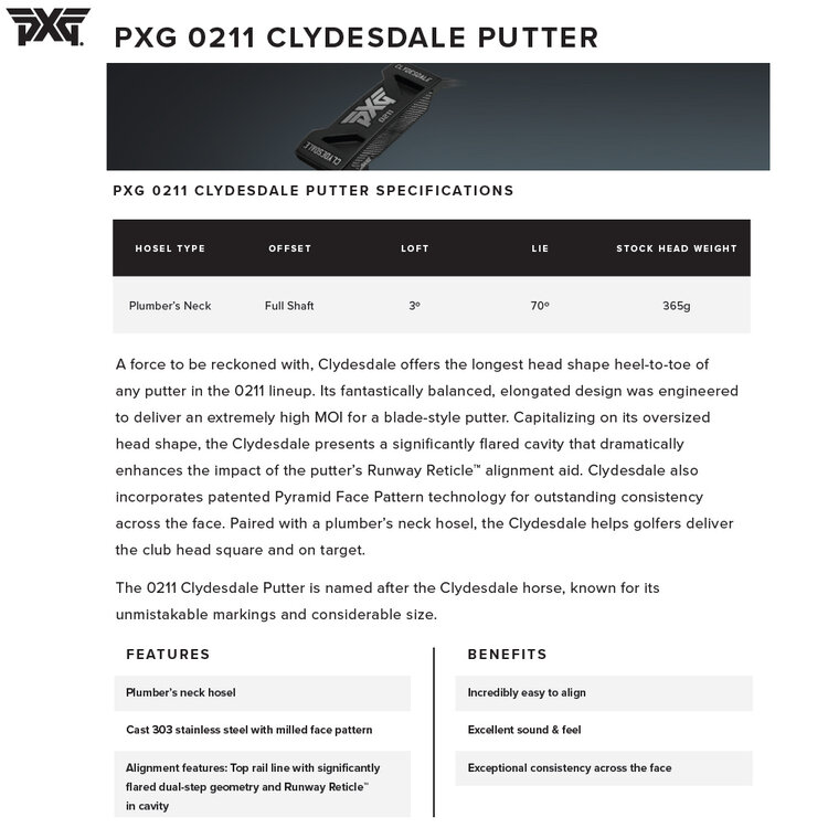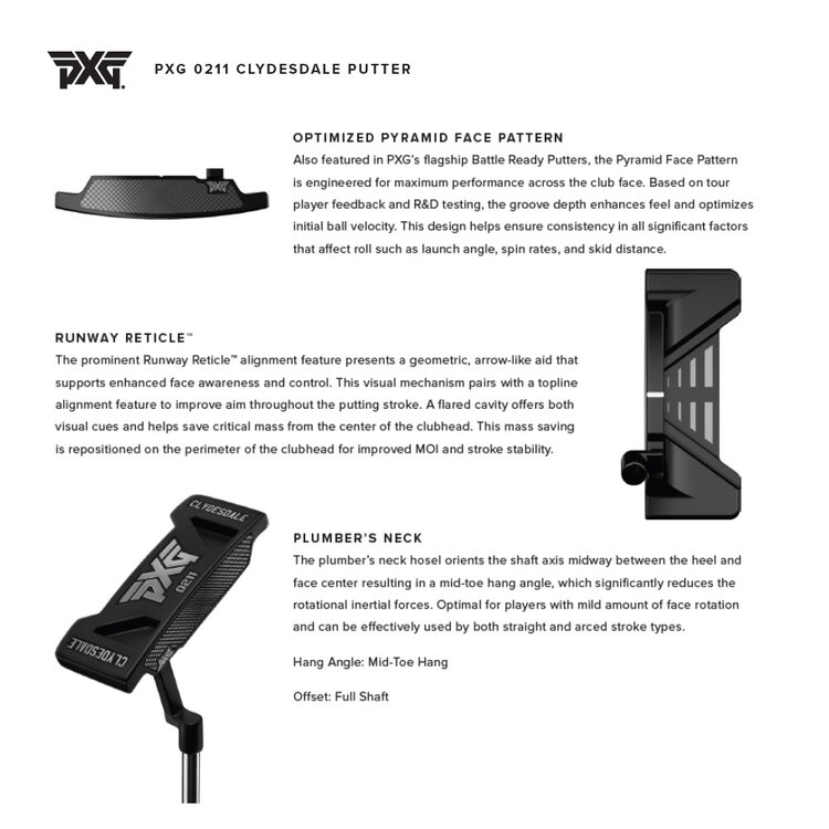 Deze PXG B0211 Clydesdale Putter is voorzien van de PXG Straight Puttershaft, een Lamkin PGX SinkFit Pistol puttergrip.