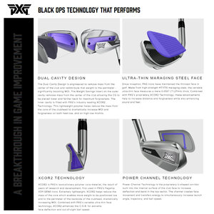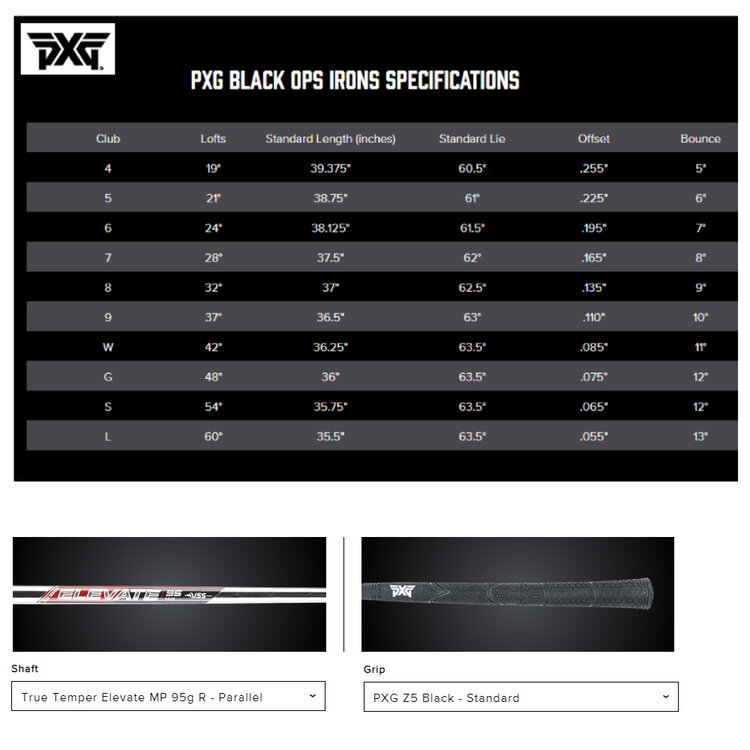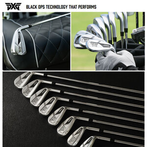 These PXG Black Ops Irons 2024 are equipped with True Temper Elevate MP 95g regular flex steel shafts and Lamkin PXG Z5 Black standard men's grip.