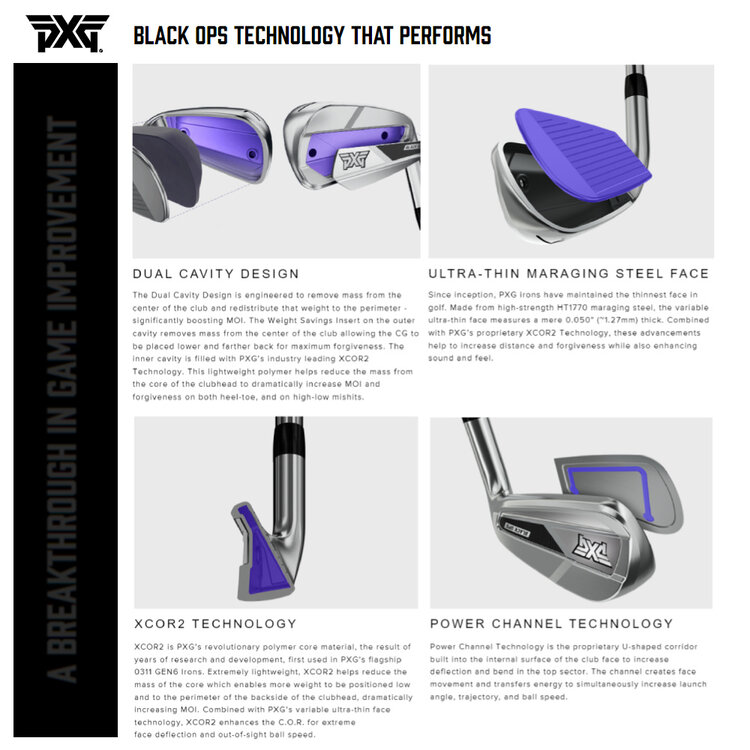 Looking at technique, these clubs are built according to the Dual Cavity Design where weight is shifted from the centre of the head to the bottom and back to create a larger Sweetspot and lower centre of gravity. The freed up space in the centre is thereby filled with the lightweight Polymer from the XCOR2 Technology which extremely increases the MOI (Moment Of Inertia). A slightly technical story but the bottom line is that a much higher MOI ensures much more forgiveness, both mishits on toe and heel of the club head and balls hit too high or too low on the clubface. So good news for those golfers who still sometimes don't hit the ball quite cleanly.... In these Black Ops clubs, the clubface has been made extremely thin for more flexibility. For this, PXG uses the HT1770 Maraging Steel Clubface Technology. Very effective to create more ball speed without losing control. Finally, there is the Power Channel Technology in these clubs, which, with a U-shaped infilling in the back of the face, ensures less deflection of your ball flight while simultaneously creating more energy transfer resulting in more ball speed and height. The feel on impact of the ball also impresses very much. In short: the Black Ops 2024 irons are fine clubs with lots of power and forgiveness!