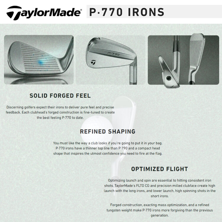 These 2024 version of the TaylorMade P-770 irons come standard with the True Temper Dynamic Gold Tour 115 MID steel shafts with the GolfPride Z-Grips +2 Any specific requirements or modifications are of course possible in consultation.