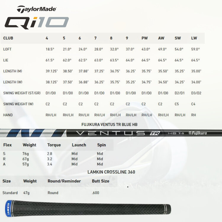 In the graphite shaft version, the TaylorMade Qi 2024 irons feature the lightweight Fujikura Ventus TR HB Blue graphite shafts and Lamkin Crossline 360 standard men's grips.