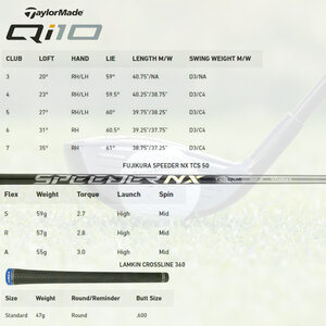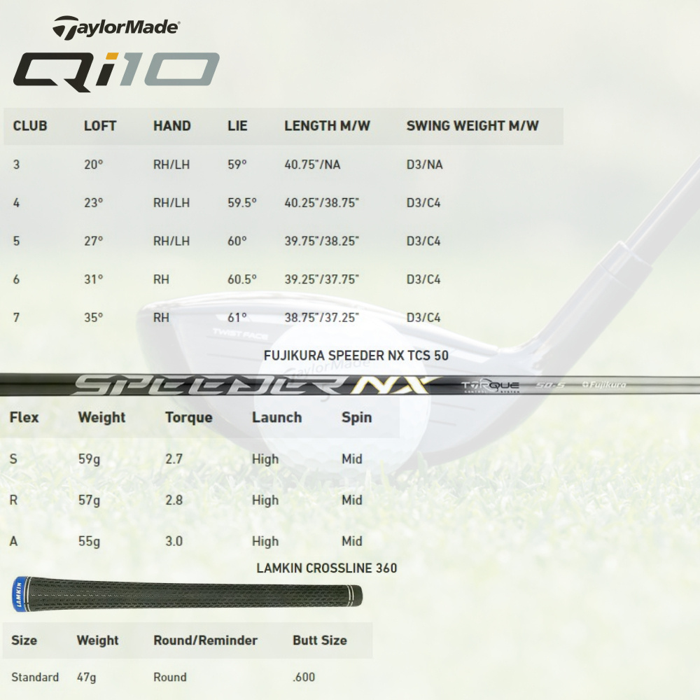 This TaylorMade Qi10 Max Hybrid Club comes standard with the Fujikura Speeder NX TCS 50 graphite shaft for a slightly higher ball flight, complemented by a 47 gram Lamkin Crossline 360 Standard men's grip.