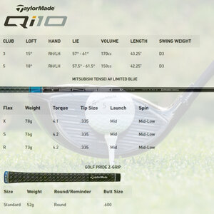 These TaylorMade Qi10 Tour Fairway Woods come in Extra Stiff Flex with the Mitsubishi Kai 'Li 75FW Graphite Shaft with 52g GolfPride Z-Grip in standard men's size.