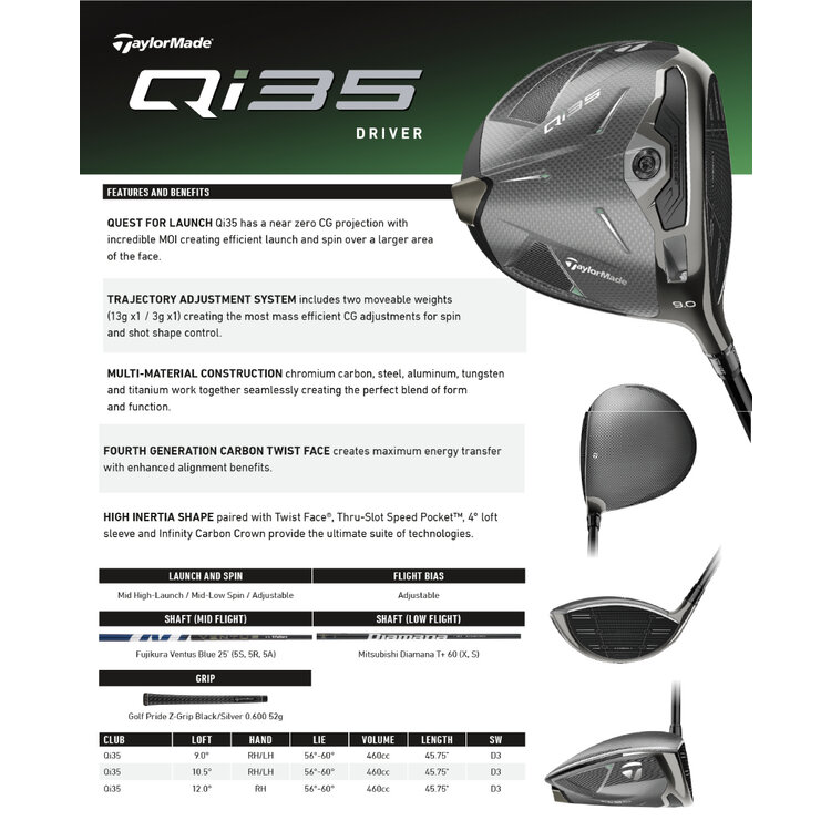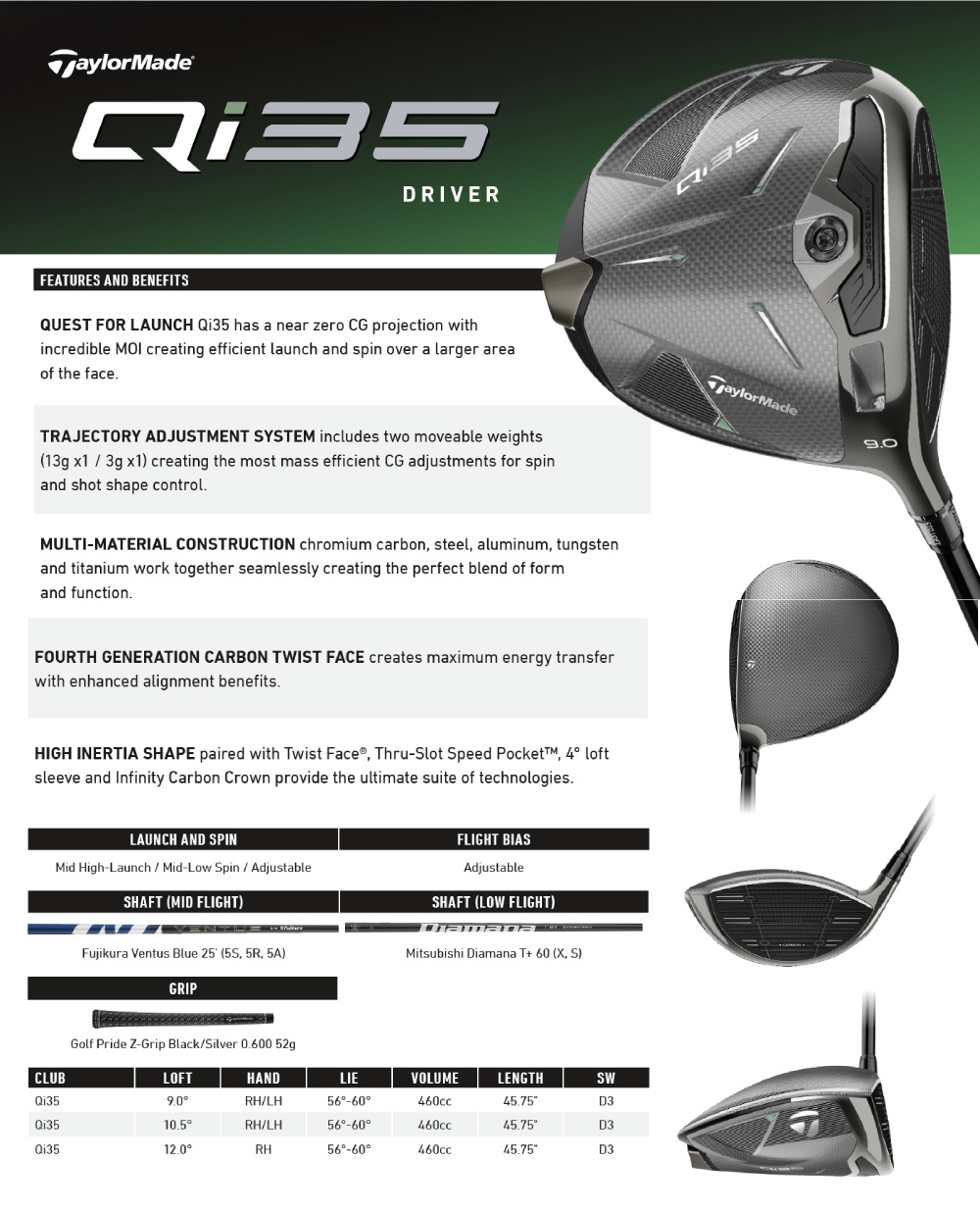 TaylorMade continues to develop anno 2025 with the Qi35 series, already the fourth consecutive season with the revolutionary 100% Carbon Clubface in the drivers. This Carbon face feels different, more explosive than the 'usual' Titanium of before. It provides more stability and more forgiveness with the 10,000 M.O.I. also ensuring less deviation in ball flight if you have not hit the ball centrally. Also new this season is the New Symetric Inertia Generator, the 34 gram weight at the back of the driver that provides much more stability. Also different this season is a considerable increase in playability due to a much lower centre of gravity (CG) in the clubhead. This makes it easier to get the ball into the air. The clubhead has a Multi Material Construction where Chromium Carbon, steel, aluminium, cast iron (Tungsten) and Titanium combine for the perfect combination in form and function. Loft adjustability (+2 to -2 degrees) also comes as standard. Finally, the High Inertia Shape and Thru-Slot Speed Pocket contribute to make this club a very fine, reliable driver.