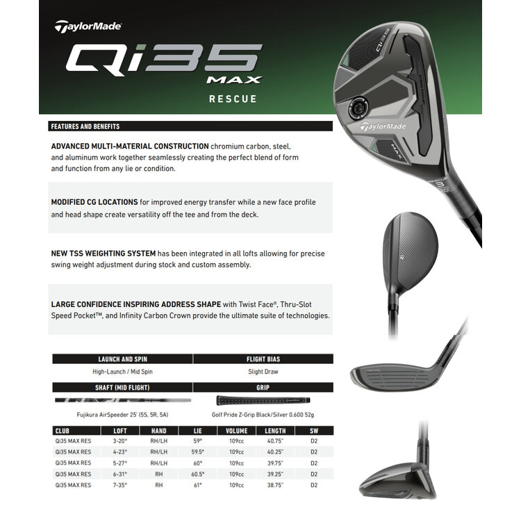 This TaylorMade Qi35 Max Hybrid Club comes standard with the Fujikura AirSpeeder '25 graphite shaft for a somewhat flatter ball flight, complemented by a 52-gram Golf Pride Z-Grip Standard men's grip (60R).