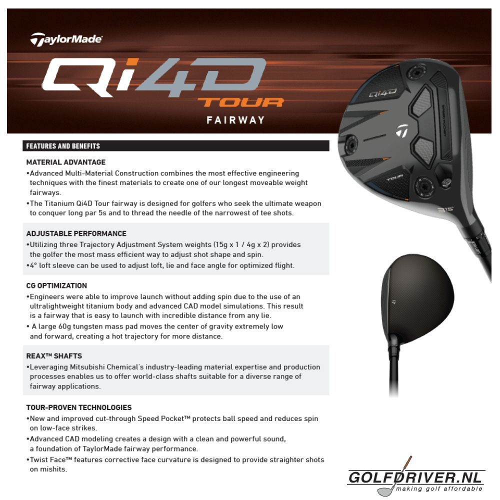 TaylorMade continues to develop rapidly with its new Qi4D golf club series. Recognizable features of this Tour Ti fairway wood model are the movable weight and the interchangeable smaller weights in the crown, which allow the balance of the club head to be fine-tuned. In addition, these Tour Ti clubs are constructed using Advanted Multi-Material Construction, which combines different materials to generate maximum performance. This model also features a 60-gram titanium sole weight for more launch power and a 4° Loft Sleeve that allows you to adjust the loft over a range of 4 degrees... Apart from these extras, there are various advanced technologies from previous models, such as Twist Face and the Cut-Through Speed Pocket, which give low-hit balls more speed and less deviation. The new Mitsubishi REAX shaft program also offers unprecedented possibilities for matching the club to your needs.
