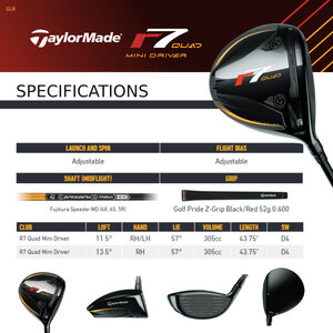 This beautiful TaylorMade Q7 Quad Mini Driver 2025 features the Fujikura Speeder MD graphite shaft and the black / red GolfPride Z-Grip Standard men's grip where the grip is of course optionally customisable to your liking.