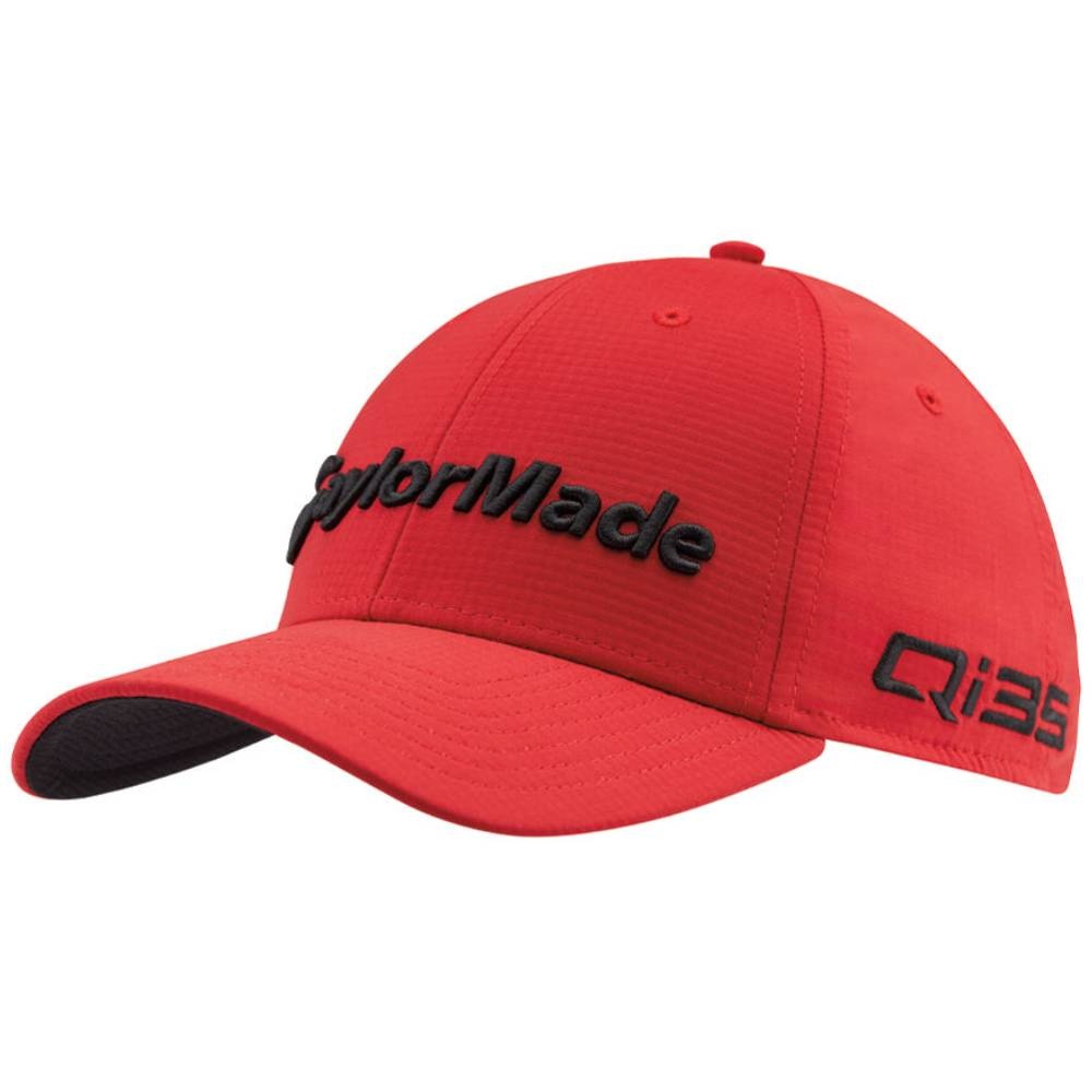 Comfortable Tour Radar 2025 golf cap in red from TaylorMade featuring a black embroidered logo on the front and Qi35 branding on the side. Curved flap.