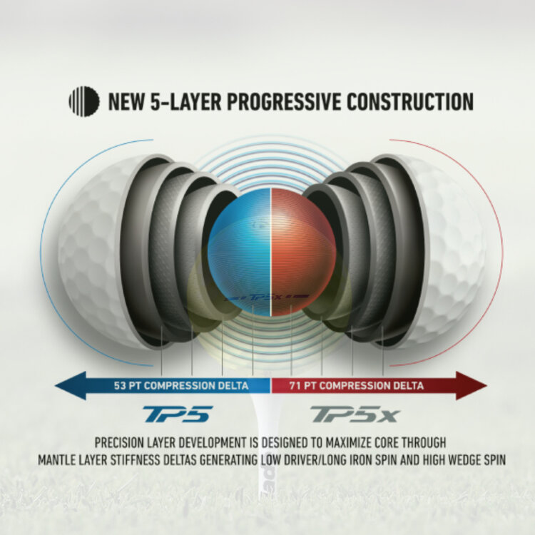 The TaylorMade TP5 2024 Golf Ball has been substantially improved thanks to the new Soft-Tough Cast Urethane Cover and Speed Wrapped Core. This explosive 5-layer Tour ball has maximum soft-feel with high ball flight has been developed for better golfers.