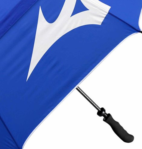 • sturdy, blue golf umbrella with white Mizuno branding