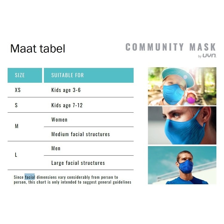 Most fabric mouth caps are made of cotton or polyester, fabrics that absorb moisture and dirt. As a result, they are quickly dirty and cannot be worn for more than a few hours. UYN mouth masks are made of TexLyte Nano Fabric (polypropylene) which is dirt-repellent, does not absorb moisture and has a heat-regulating effect. As a result, they stay clean longer and do not become a sweaty, sticky mess. In order to be able to spend the whole day with a mouth cap, the comfort must be optimal. Our UYN mouthpieces are ergonomically shaped and slightly elastic so that they perfectly fit the contours of the face. They are also super light: no less than 50% lighter than cotton, 34% lighter than polyester and 20% lighter than nylon, making it easy to wear a UYN Community Mask for a long time.
