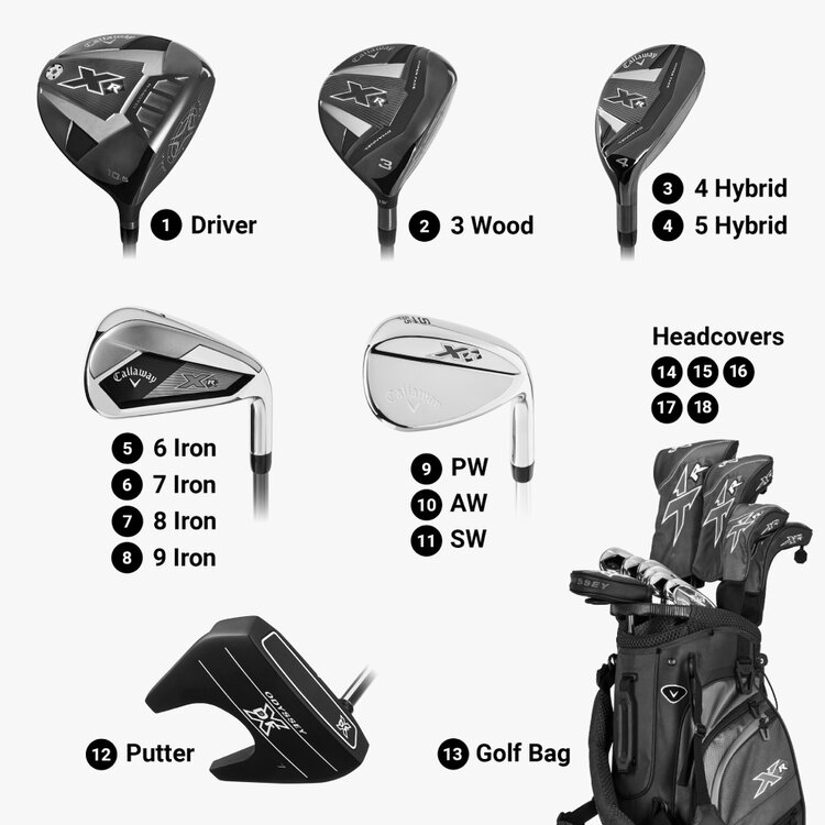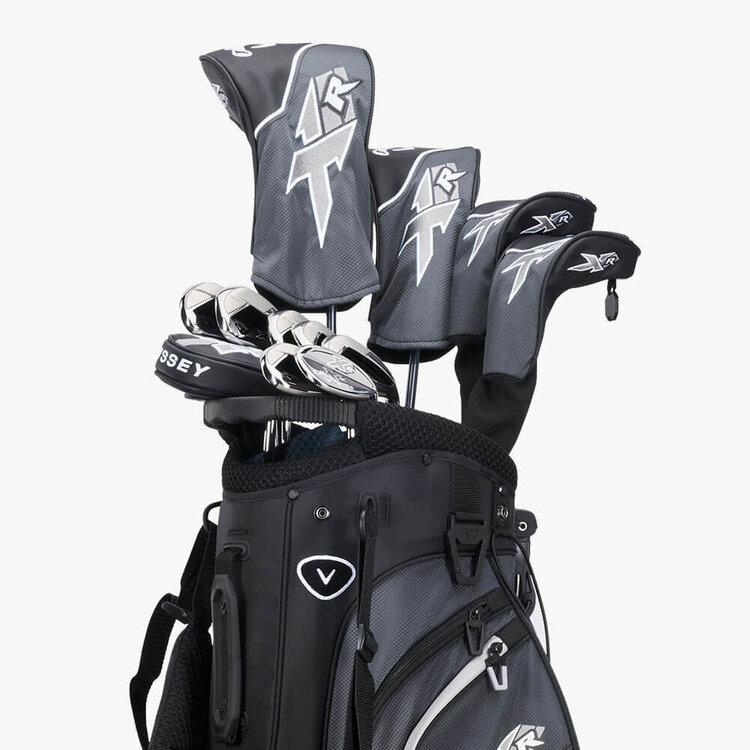 De Callaway XR clubs zijn inmiddels een begrip als het gaat om prijs / kwaliteitsverhouding. In deze versie is de combinatie van power en vergevingsgezindheid bij deze clubs opmerkelijk goed. Alle clubs zijn voorzien van veel 'vergevende' techniek om golf gemakkelijker en leuker te maken. Deze Callaway XR driver heeft de effectieve R-Moto Clubface Innovatie waarbij het in dikte variërende slagvlak zorgt voor enorme balsnelheden. Daarnaast zijn de XR fairway wood en hybride clubs uit deze set voorzien van de Hyper Face Channel Technique. Dit zorgt dat de clubs wél heel krachtig zijn maar dit niet ten koste gaat van de vergevingsgezinde eigenschappen. Vooral bij niet zuiver maar off-center geraakte ballen, blijft de balvlucht opvallend voorspelbaar. De Callaway XR ijzers en wedges zijn gemaakt in klassiek Game Improving ontwerp waarbij een laag zwaartepunt, een grote Cavity Back (holte achter het slagvlak) en een enorme Sweetspot zorgen voor een betere speelbaarheid. De fijne Odyssey Mallet putter (made by Callaway) maakt de set compleet. Deze oversized putter heeft een duidelijke belijning en een perfecte balans waardoor met vertrouwen putten, geen hogere wiskunde meer is.