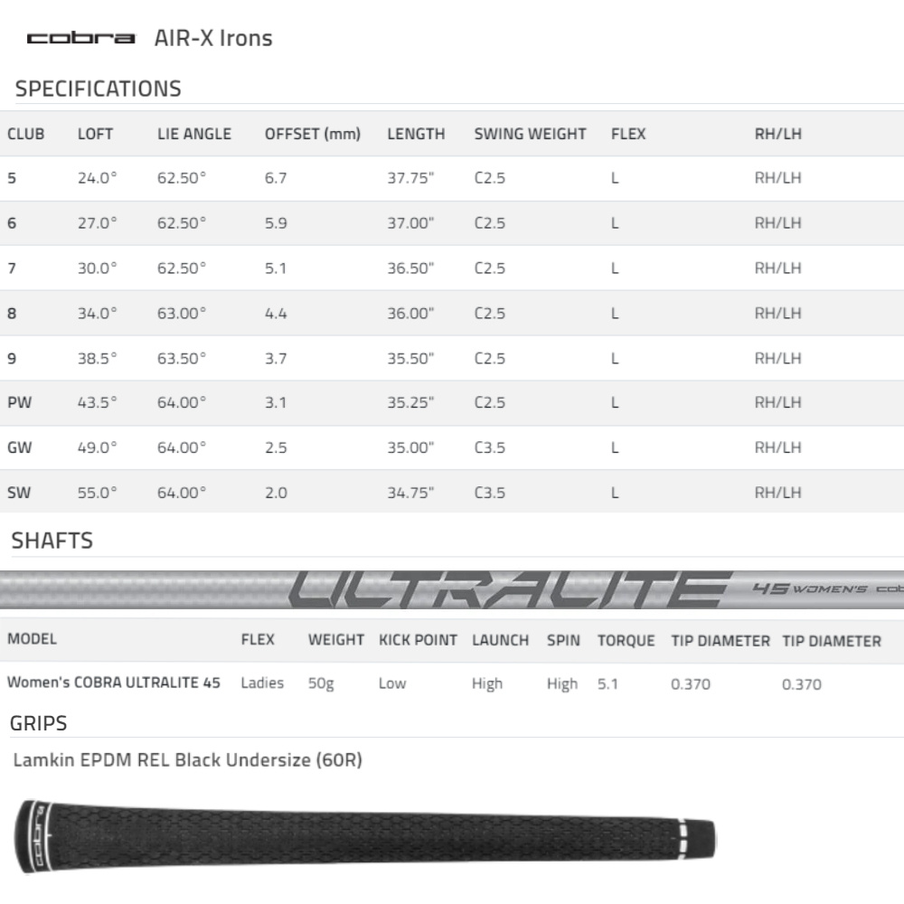 Voor de starters tot licht gevorderde spelers, de grootste doelgroep in de golfsport, heeft Cobra voor seizoen 2024 de tweede generatie Cobra Air-X (2) Ladies ijzers geïntroduceerd. Deze eenvoudiger speelbare clubs, in dit geval met graphite shafts, staan bekend om het feit dat ze speciaal voor golfers met rustigere swing meer lengte brengen. Mooie, vergevingsgezinde clubs met het flexibele H.O.T. Face slagvlak voor meer balsnelheid.