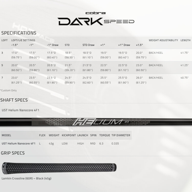 Deze Cobra DarkSpeed Max Ladies fairway woods hebben af-fabriek de UST Helium NanoCore 4F1 graphite shaft en Lamkin Crossline Black standard dames maat (undersize) grips.