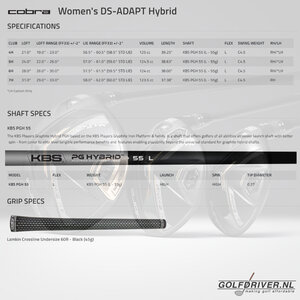 Deze Cobra DS-Adapt 2025 dames hybride clubs worden standaard geleverd met lichte Cobra KBS PGi 55L graphite shaft en de fijne Lamkin CrossLine UnderSize Ladies grip.
