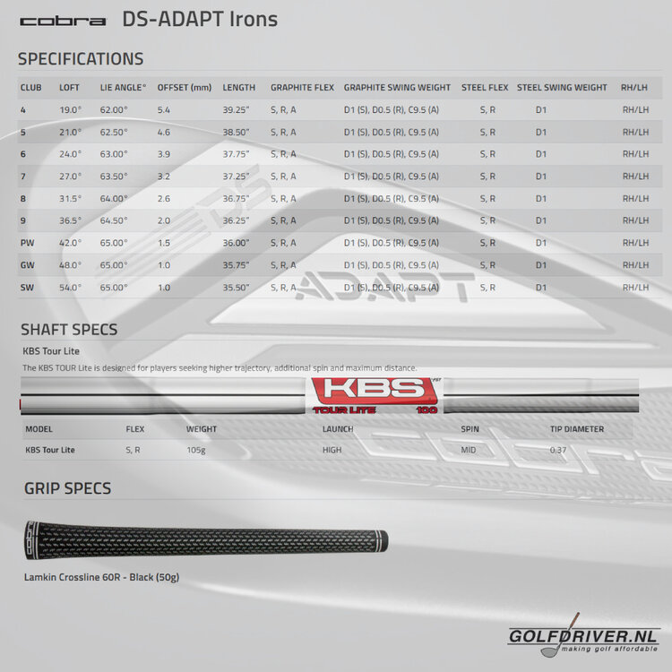 In de Cobra DS Adapt serie van 2025 zijn er twee versies in de ijzers, gericht op twee verschillende niveau golfers. Zo zijn deze 'normale' DS-Adapt ijzers bedoeld voor golfers met een handicap van 5 tot 24 terwijl de Cobra DS-Adapt Max versie zijn geoptimaliseerd voor de golfers met handicap boven de 20. Verschil tussen die twee soorten ijzers kun je herleiden tot iets hogere lofts en balvlucht bij de Max uitvoering. Ten opzichte van de DS-Adapt Max uitvoering lever je met de DS-Adapt wat vergevingsgezindheid in in ruil voor afstand en meer gevoel. Subtiele verschillen die zorgen voor een iets ander karakter.