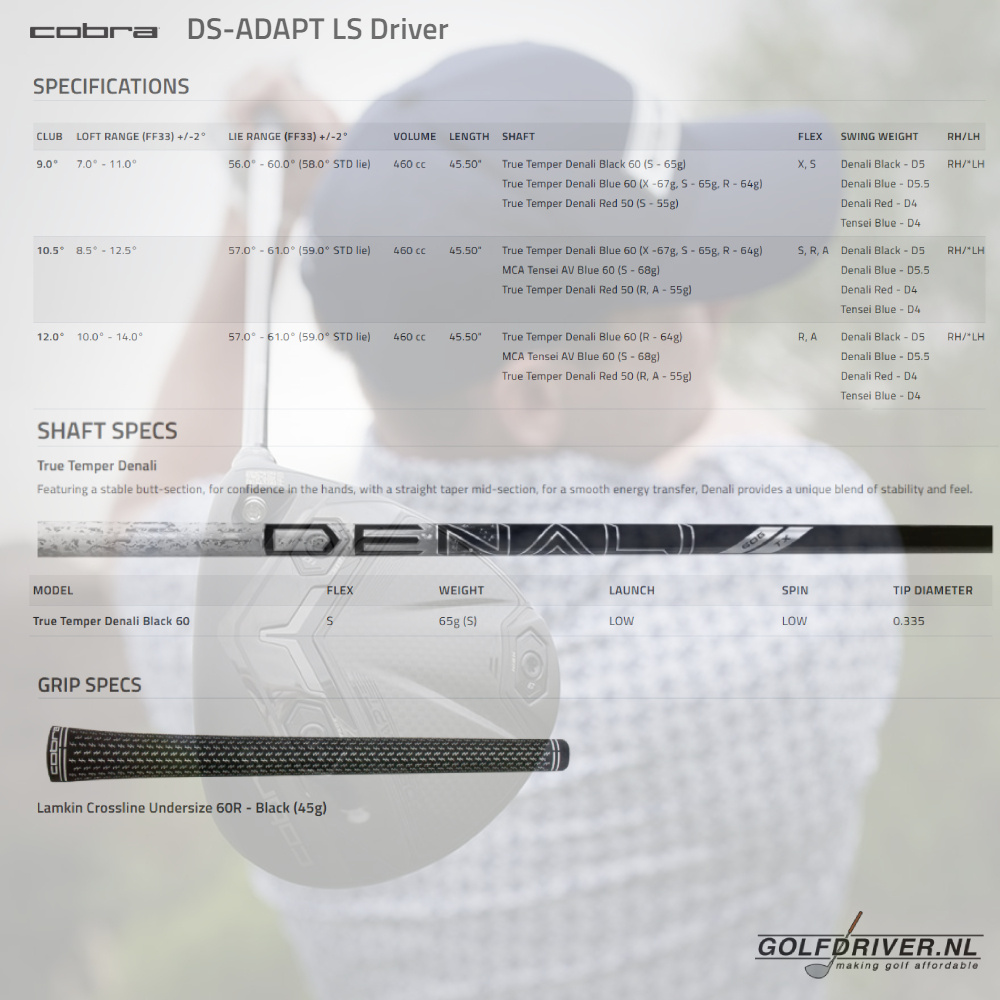 Deze Cobra DS-Adapt LS Driver wordt standaard geleverd met een True Temper Denali Graphite Shaft en Lamkin Crossline 60R Black standard size heren grip. In overleg kunt u uiteraard ook kiezen voor een andere shaft of grip.