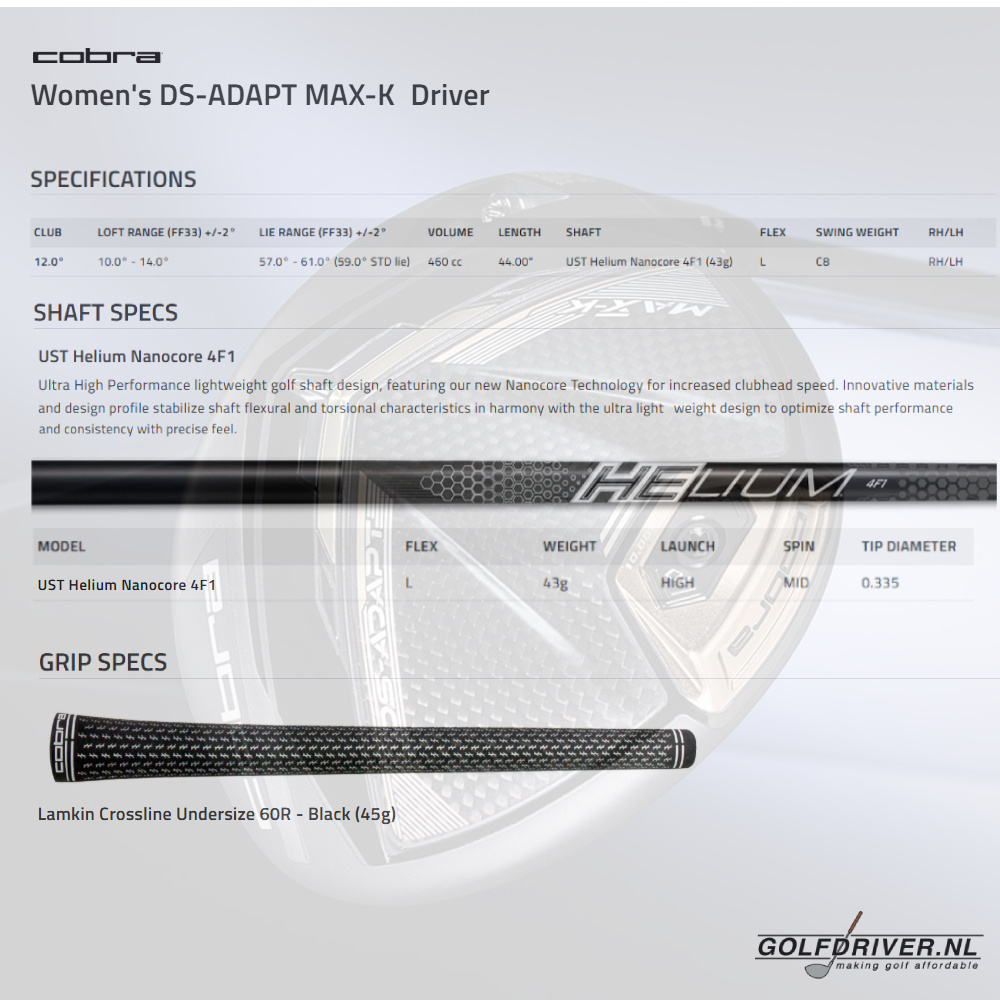 Deze Cobra DS-Adapt Max-K Dames Driver wordt standaard geleverd met een UST Helium Nanocore Dames Graphite Shaft en Lamkin Crossline 60R Black undersize dames grip. In overleg kunt u uiteraard ook kiezen voor een andere shaft of grip.