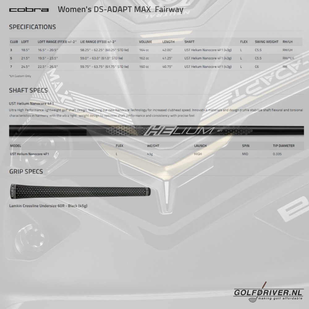 Deze LINKSHANDIGE Cobra DS-Adapt Max Ladies fairway woods zijn standaard de Helium NanoCore graphite shaft en Lamkin Crossline Black 58R standard dames Undersize maat grips.