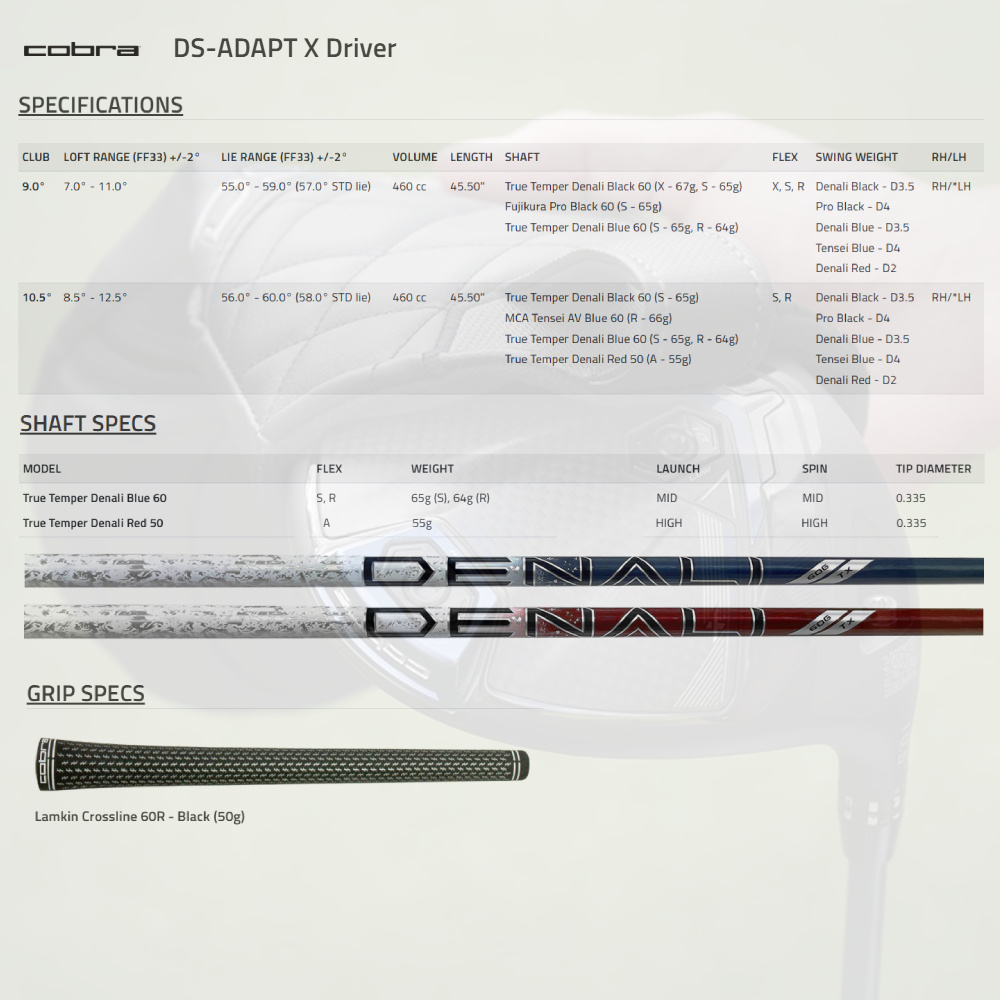 Deze Cobra DS-Adapt X Driver wordt standaard geleverd met een True Temper Denali Graphite Shaft en Lamkin Crossline 60R Black standard size heren grip. In overleg kunt u uiteraard ook kiezen voor een andere shaft of grip.