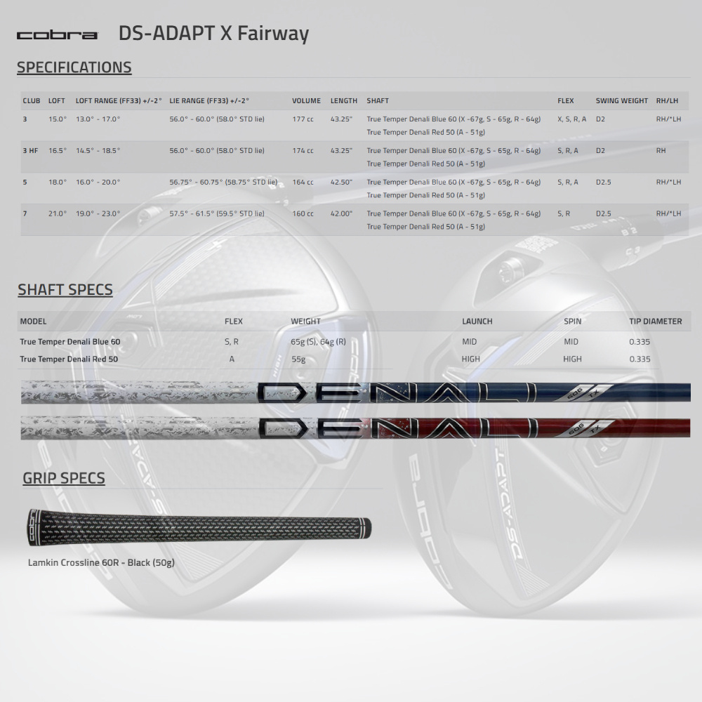 Deze Cobra DS-Adapt X fairway woods zijn standaard de True Temper Denali graphite shaft en Lamkin Crossline Black 60R standard heren maat grips.